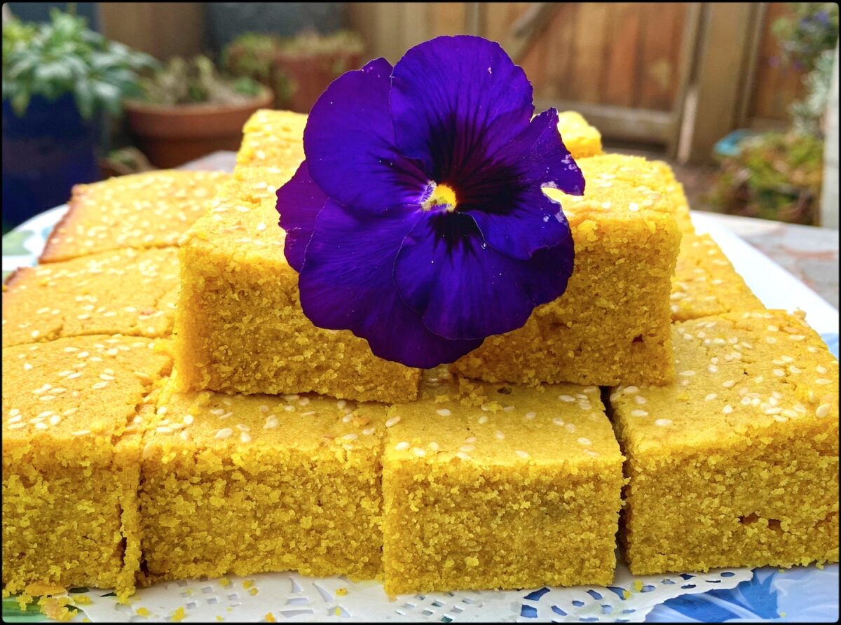 “Sfouf” is a Lebanese Semolina and Turmeric Cake. (Sfouf means “rows” or “lines”) This simple plant-based recipe is uniquely delicious and a vibrant, golden yellow.